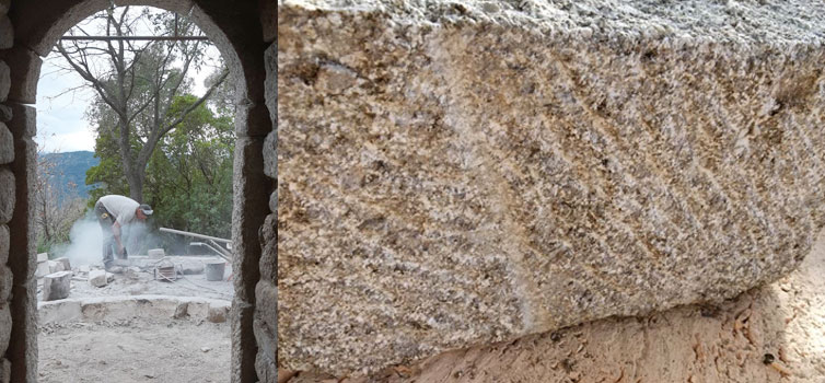 Une finition à pierres vues afin de fondre et intégrer l’enduit dans la suite de la construction en pierre. Le principe est de combler les joints à fleur de parement, les pierres en saillie restent apparentes, le mortier est projeté dans les joints. Chaux hydraulique naturelle, sable 0,2 mm de carrière (jaune pâle)